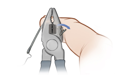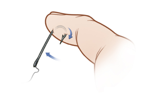 2. Push the hook the rest of the way through the skin so the barb comes out through the skin.