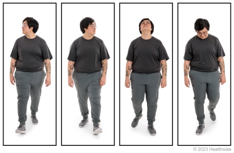 - Walk and turn your head to one side as you walk. With every other step, turn your head to the other side. Try to walk about 50 feet.